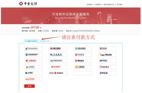 需要提醒:如果是企业对公网银账户支付 选择“企业账户支付”中的选择银行,如果是个人网银账户支付,请点击“个人借记卡支付”中选择银行。
