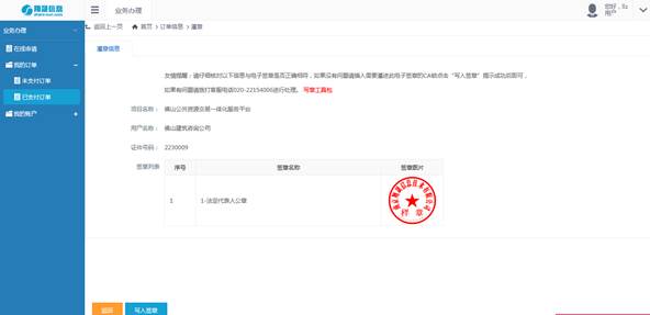 审核通过后,业务人员将您申请的电子签章制作上传到此系统后,当条订单状态将会标记为“待灌章”,如图八所示: