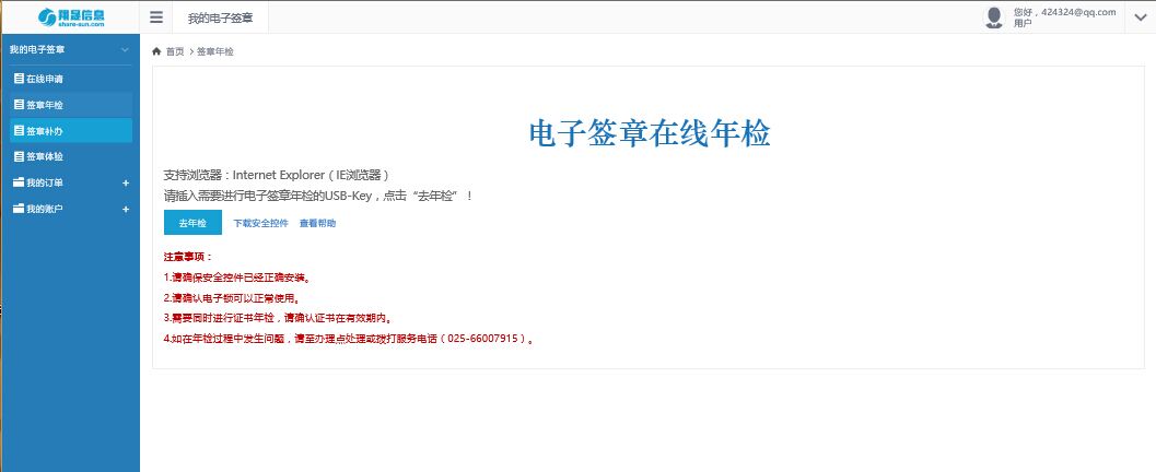 如图:进入在线年检页面,请插入需要进行电子签章年检的USB-Key,点击“去年检”按钮。