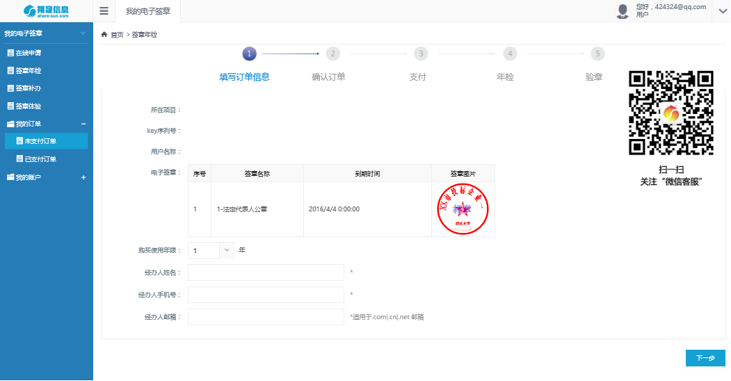 准确填写年检购买的年限,经办人的姓名、手机和邮箱后点击下一步。