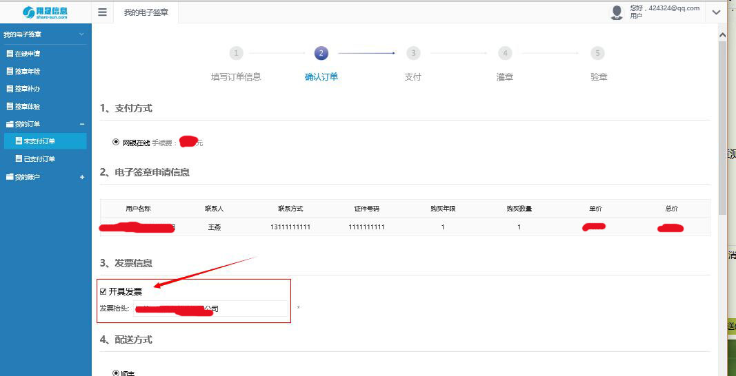 确认各项申请信息是否正确,并显示电子签章(含数字证书)费用、运费、支付手续费以及总价。如果无问题点击“前往付款”按钮进行支付。