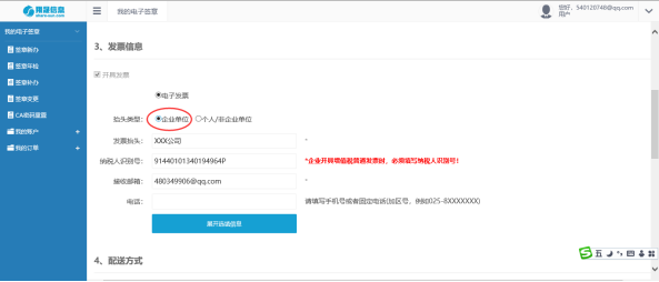 2发票信息发票统一为增值税电子普通发票,在下订单时用户自行填写发票信息*号为必填项,如果需要填纳税人识别号需要选择“企业单位”。如下图所示以下所填信息为发票信息当订单状态显示“完成”时,系统按下订单时填写发票信息自动开发票。