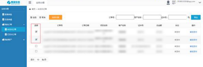 勾选上需要合并支付的订单,点击“合并订单”按钮即自动生成订单合并后的总金额再前往支付