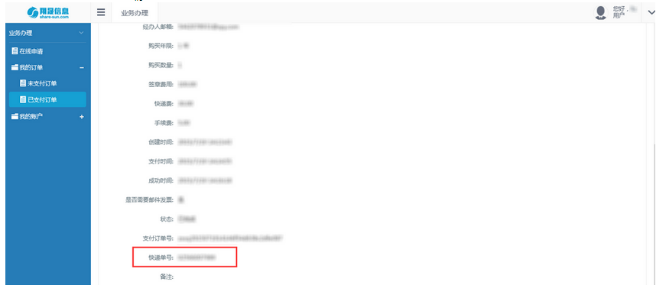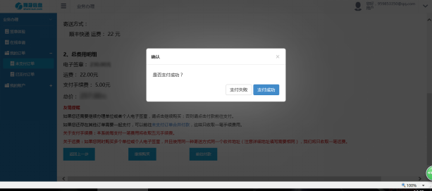 支付成功后我们将立即为您的订单做业务办理,并且在付款成功后的一个工作日内将您申请的USB_KEY寄出,此时在您的已支付订单列表中,此条订单状态标记为“处理中”,如下图所示: