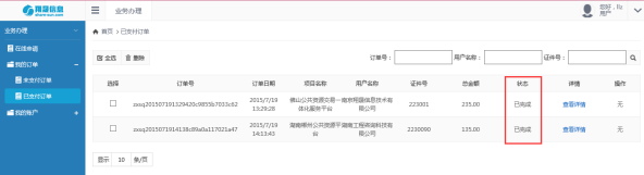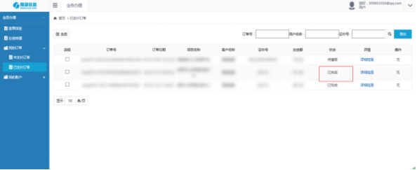 业务人员将您申请的电子签章(含数字证书)制作完成后,统一用EMS快递寄出去,此时此订单状态将会标记成“已完成”,如下图所示