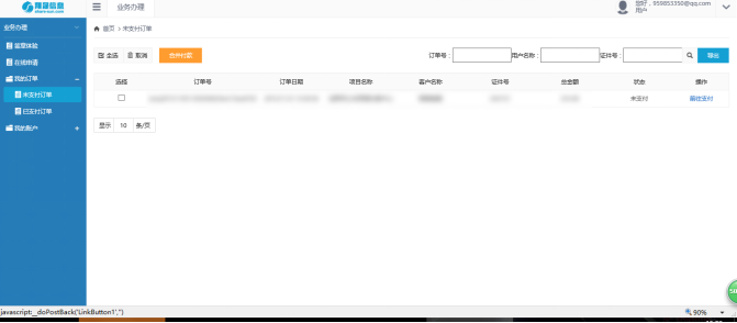 登录进入系统后点击左侧第二个主菜单项“我的订单”,分别出现子菜单为未支付、已支付订单。如图所示,选择菜单中的支付订单查看当前未支付的订单的列表,想删除未支付订单的记录,则勾选上对应记录前的选择复选框后,点击取消按钮进行批量删除处理或单条记录删除处理。