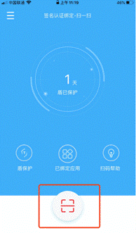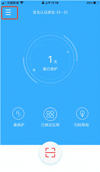 登录成功后主页面中间显示3个模块:盾保护、已绑定应用、扫码帮助