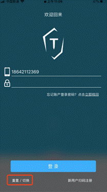 通过以下步骤进行用户重置:点击登录页面左下角“重置/切换”按钮 → 手机盾安全扫码界面