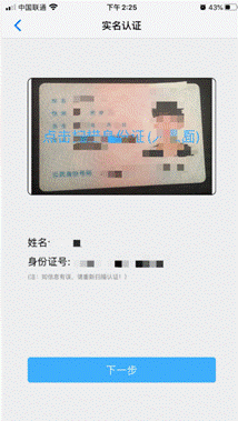 通过以上步骤跳转到“实名认证”界面:“点击扫描身份证” → 扫描个人身份证 → 成功后,跳转到“实名认证”界面 → 确认个人信息正确后,点击“下一步”,界面如图: